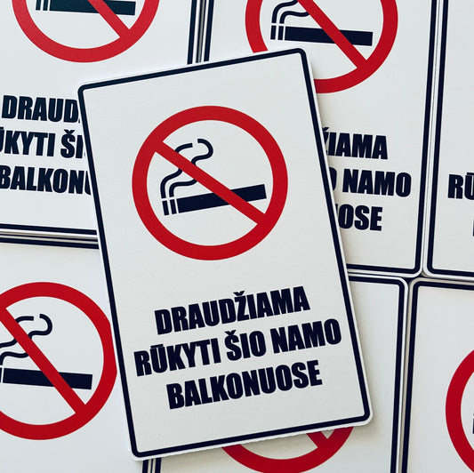 IšpardavimasŽenklas su užrašu "DRAUDŽIAMA RŪKYTI BALKONUOSE"