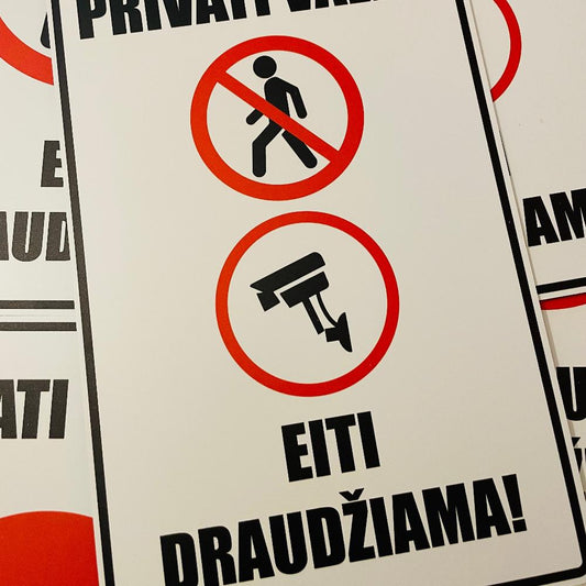 Ženklas su užrašu "PRIVATI VALDA TERITORIJA STEBIMA VAIZDO KAMEROMIS"