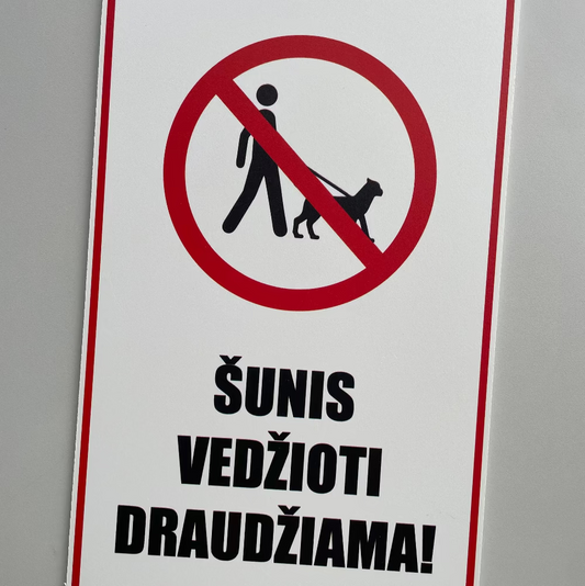 Ženklas su užrašu "ŠUNIS VEDŽIOTI DRAUDŽIAMA"